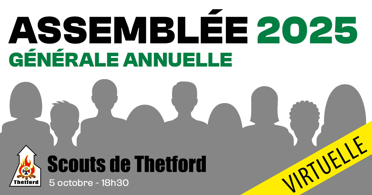 Les Scouts de Thetford invitent tous les membres adultes ainsi que tous les parents des membres jeunes à leur assemblée générale annuelle 2025. L’AGA est une bonne façon pour les parents de se tenir informé des activités générales de tout le mouvement scout à Thetford.