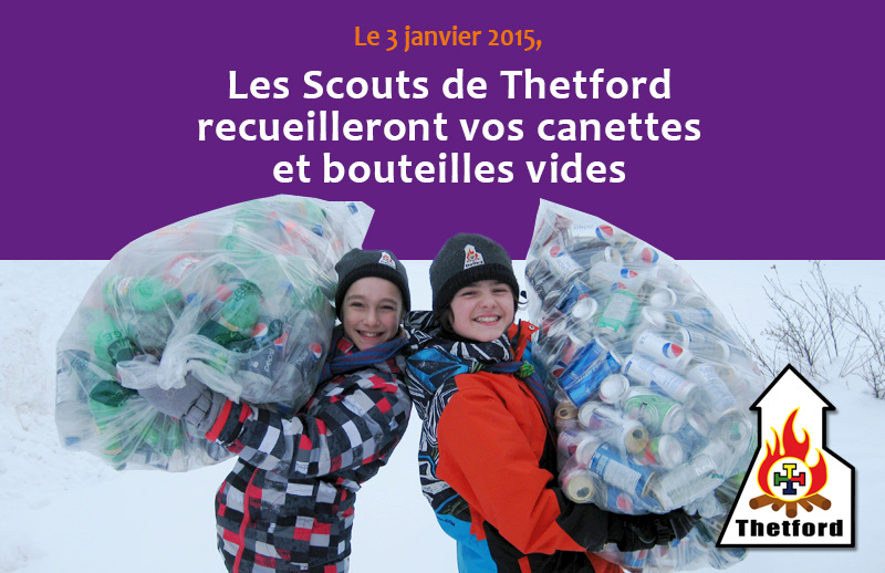 Les Scouts de Thetford invitent la population des secteurs Black Lake et Thetford Mines à conserver bouteilles et canettes vides du temps des Fêtes pour une grande collecte qui se tiendra le samedi 3 janvier 2015 à compter de 9h30.