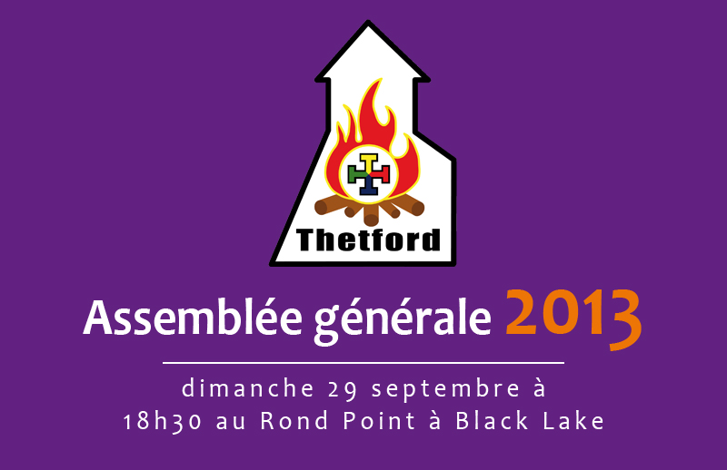 Les Scouts de Thetford invitent tous les membres adultes ainsi que tous les parents des membres jeunes à leur assemblée générale 2013. L’assemblée générale est une bonne façon pour les parents de se tenir informé des activités générales de tout le mouvement scout à Thetford. Vous pourrez rencontrer les animateurs de toutes les unités ainsi que les membres du conseil d’administration.