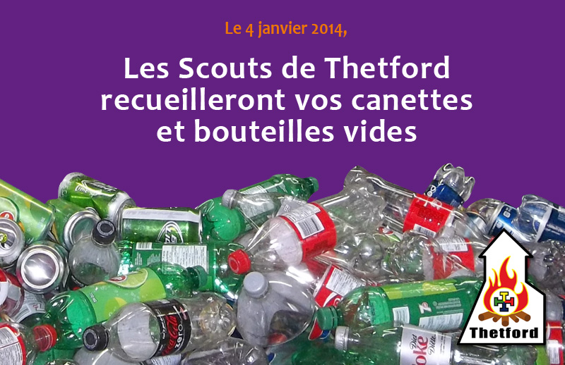 Les Scouts de Thetford invitent la population des secteurs Black Lake et Thetford Mines à conserver bouteilles et canettes vides du temps des Fêtes pour une grande collecte qui se tiendra le samedi 4 janvier 2014 à compter de 9h30.